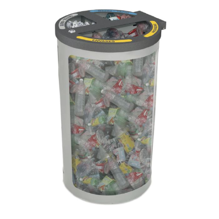 Papelera de seguridad y de reciclaje para la separación de residuos que facilita la inspección visual de su interior, ideal para entornos con gran afluencia de público como aeropuertos, puertos, o centros comerciales por ejemplo.