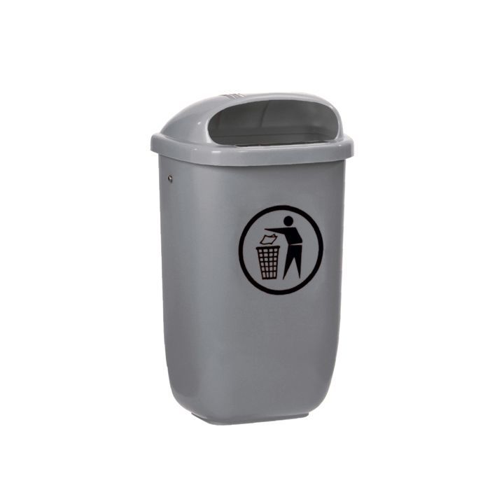 Papelera urbana fabricada en polietileno de alta densidad anti UV, fácil de vaciar por balanceo, fijación mural o sobre poste y fondo perforado para la evacuación de los líquidos.