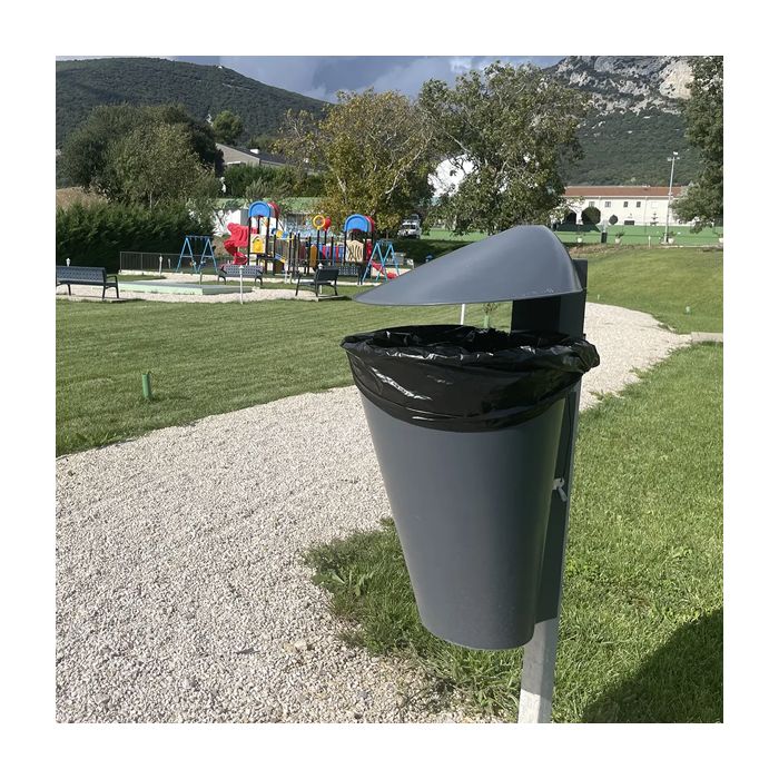 La papelera urbana de polietileno Nim 55 litros con capucha y cubeta abatible es resistente a la intemperie, no se oxida y no requiere mantenimiento. Ideal para su instalación en postes y farolas.