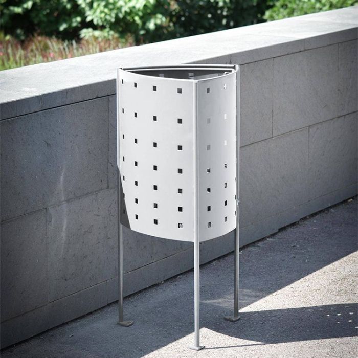 La papelera de exterior tiene una cubeta de acero galvanizada reforzada con ventanillas realizadas con láser, con tratamiento Ferrus, proceso protector del hierro que garantiza una óptima resistencia a la corrosión. Imprimación epoxi y pintura poliéster en polvo color gris RAL9006. Cubeta apoyada en una estructura maciza y base de anclaje triangular con agujeros para su fijación al suelo. Anclaje recomendado: Mediante tres pernos de expansión M8.