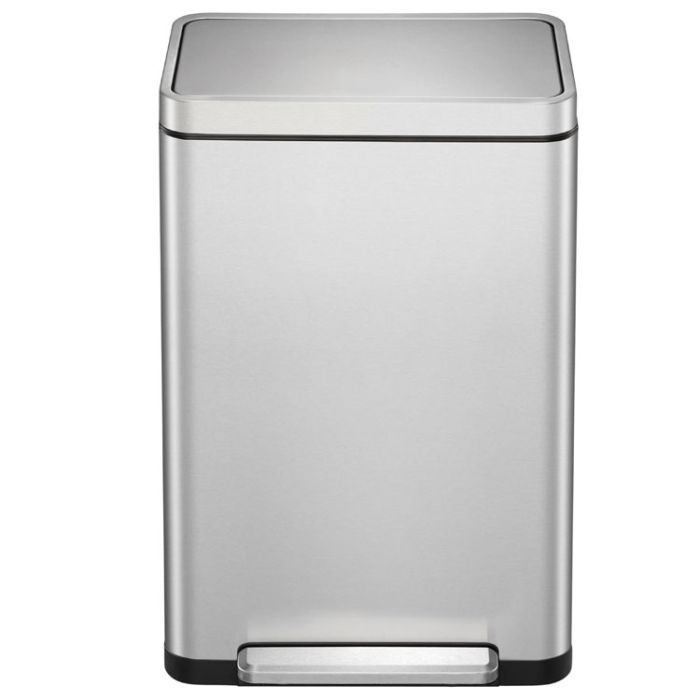 Papelera rectangular con pedal extra ancho, cubeta interior de plástico, tapa de cierre amortiguado y función de permanencia abierta, fabricada en acero inoxidable satinado con tratamiento anti-huellas y anti-bacteriano.