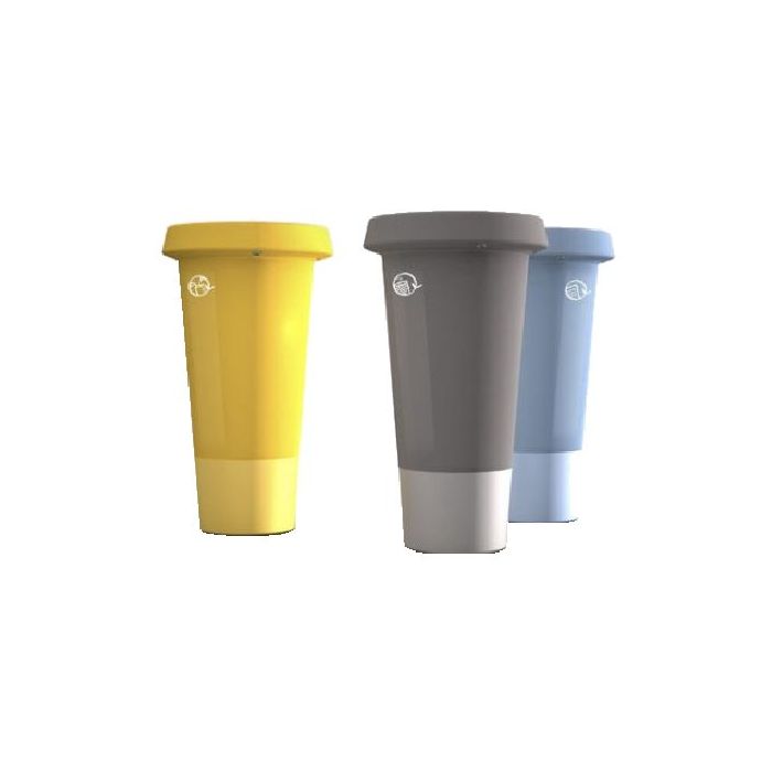 Papeleras de exterior apilables y empotrables especiales para playas con una capacidad de 165 litros fabricadas en polietileno rotacional con protección UV y compuesta por dos piezas que se unen mediante rosca y cierre de seguridad.