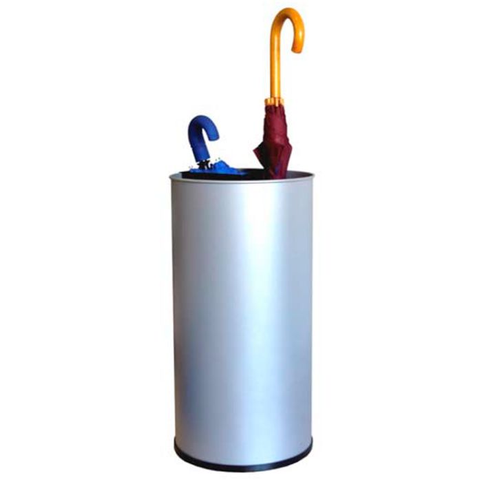 Paragüero metálico para depositar paraguas largos y cortos que dispone de un recipiente en pvc de alta resistencia, en color gris oscuro para depositar el paraguas corto e incorpora una alfombrilla recoge-agua de rizo sintético en color negro.