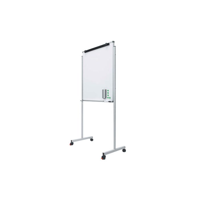 Pizarra magnética de caballete blanca de acero vitrificado, enmarcada con perfil de aluminio anodizado natural, cantoneras redondeadas de plástico y montada con soporte metálico forma T con ruedas.