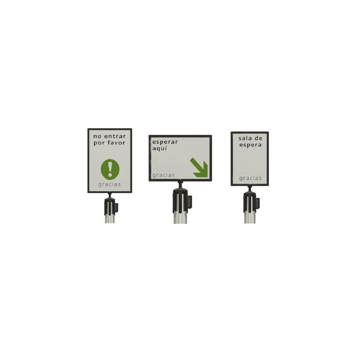 Fijación fácil sobre el poste. Para mensajes de varios formatos de una o dos caras. Los porta pancartas se pueden combinar con prácticos expositores de folletos. Metacrilato de alta resistencia. Práctica gama de porta pancartas y expositores acoplables a los Postes con Cinta Retráctil.