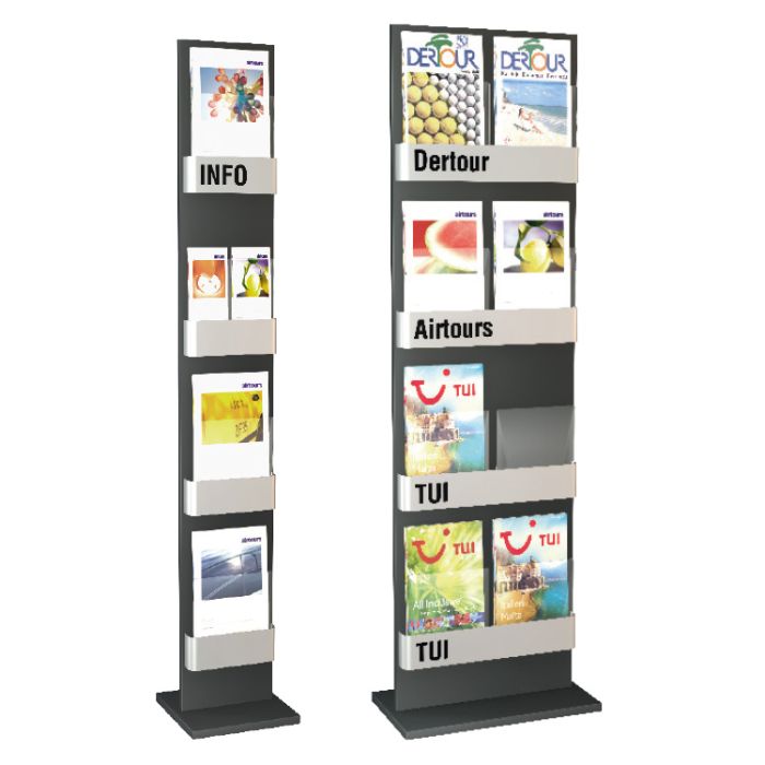 Elegante portafolletos de pie formato DIN A4, DIN A5 y flayers con cuerpo fabricado en acero con recubrimiento en polvo de antracita.