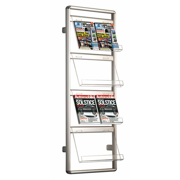 8 folletos expuestos al mismo tiempo. Ideal tiendas, galerías y bancos. La altura del conjunto es de 1450 mm. Los estantes transparentes están fabricados de acrílico de 4 mm. Las patas son de aluminio. Medidas: 1450 mm de alto x 520 mm de ancho x 240 mm de fondo. Compatible con formato Din A3 horizontal.