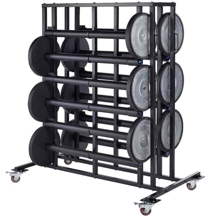 Este carro está especialmente estudiado para transportar y almacenar con toda seguridad 12 postes. Equipado con 2 ruedas pivotantes con freno y 2 ruedas fijas.