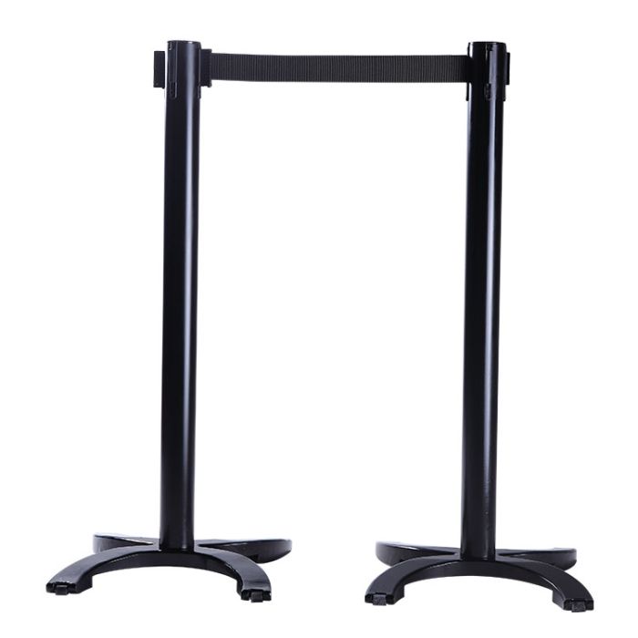Los postes con cuerda elástica o retráctil son de acero con recubrimiento de polvo de 15/10 de grosor con un pie de hierro fundido equipado con ruedas. Tiene tres entradas y una salida para que pueda cambiar fácilmente la configuración de sus carriles de circulación.