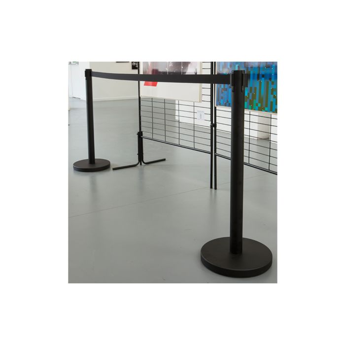 Sistema eficaz, práctico y económico para delimitar espacios. Poste de acero inoxidable o negro con cinta retráctil negra, roja y azul de 2 m o de 3 m (extensión recomendada 1,80 m y 2,80 m) y enganches de 3 vías. Otros colores de cinta consúltenos.