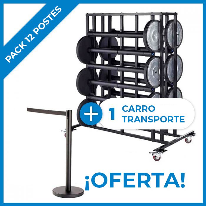 - 12 postes Ecobarrier negros con cinta y el carro.
