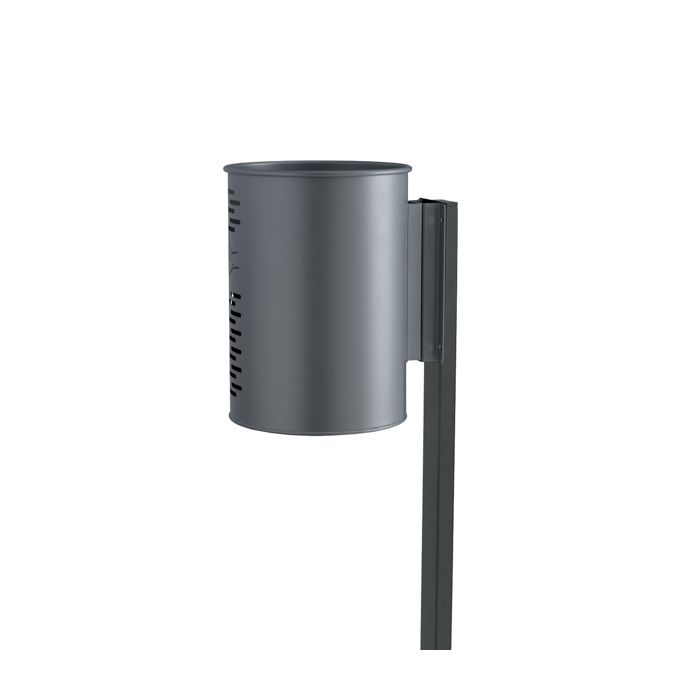 Papelera urbana cilíndrica en acero pintado gris claro, para uso en exteriores con fondo perforado y fijación mural con vaciado por inclinación de la papelera y un elástico para detener la bolsa.