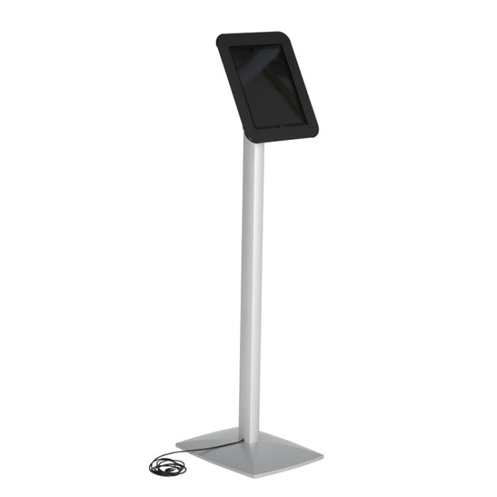 Con la ayuda de un cabezal ajustable, y una altura regulable, se puede puede fijar la posición y la orientación de la tableta fácilmente con este soporte de pie.