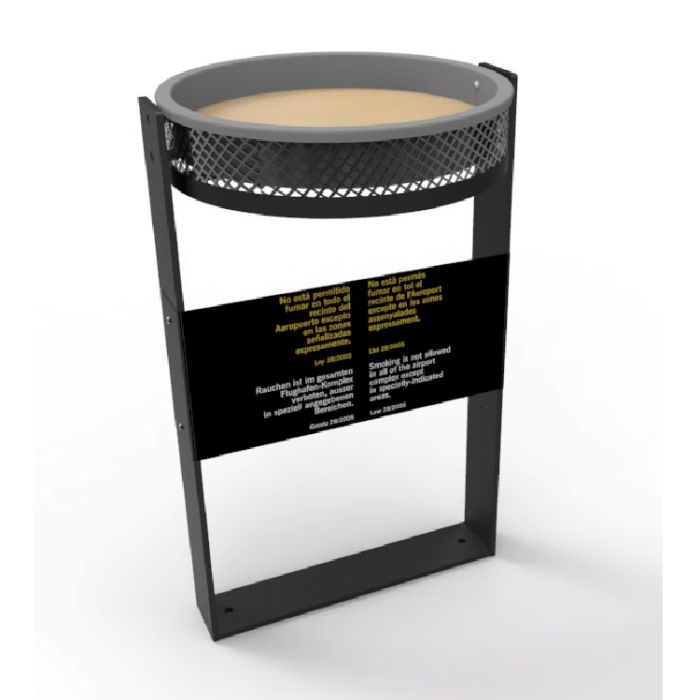 Este cenicero arenero para exteriores en plancha de aluminio estampada con panel informativo, permite la recogida de colillas con seguridad, sin olor a cigarrillo y los apaga rápidamente sin riesgo de incendio.