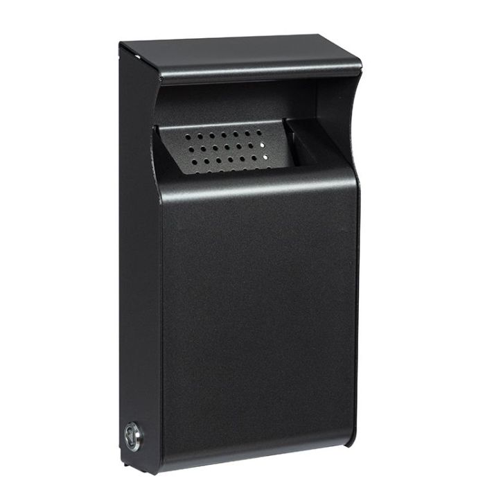 El cenicero de pared Estilo de exterior es ideal para amueblar zonas de fumadores, asegura la limpieza de los espacios colectivos y está fabricado de acero con recubrimiento de polvo con protección contra la intemperie, tratamiento anti-UV y anticorrosión.