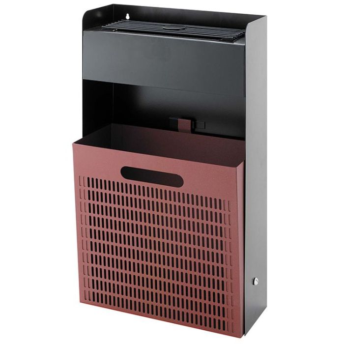 Papelera metálica de pared perforada, basculante y abatible con cenicero incorporado ideal para las entradas a edificios, cafeterías, restaurantes, hoteles, universidades, entidades públicas o privadas, etc.