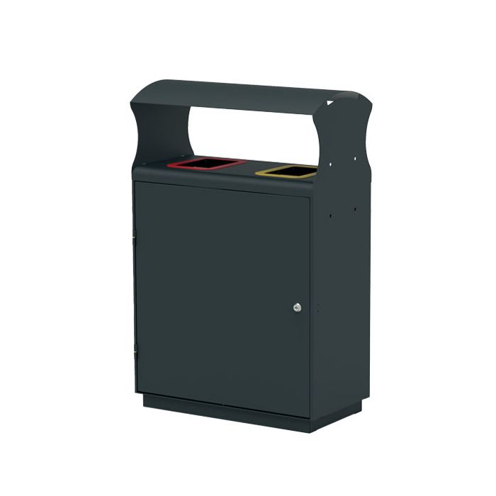 Esta papelera de reciclaje cuenta con dos aberturas estratégicamente ubicadas, lo que facilita la separación y el reciclaje eficiente de diferentes tipos de residuos. Además, los marcos de colores para la recogida selectiva permiten una identificación clara y rápida de los contenedores correspondientes, fomentando así una práctica de reciclaje organizada y efectiva.