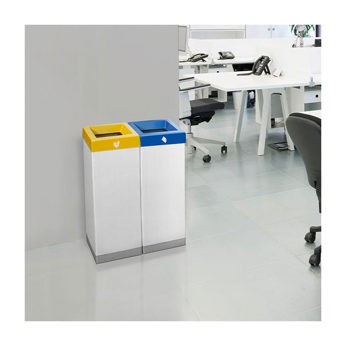 La tapa, fabricada en polipropileno con protección contra los rayos UV, está disponible en siete colores distintos para facilitar la identificación del tipo de residuo. Además, cada papelera puede llevar un kit de adhesivos de colores y símbolos para personalizar la clasificación según las necesidades del usuario.