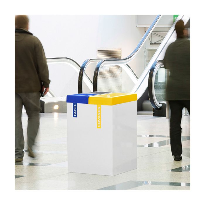Combina un cuerpo metálico resistente con tapas de colores, facilitando la identificación de cada residuo. Puede incluir adhesivos con símbolos y colores combinables para personalizar cada apertura según el tipo de residuo.