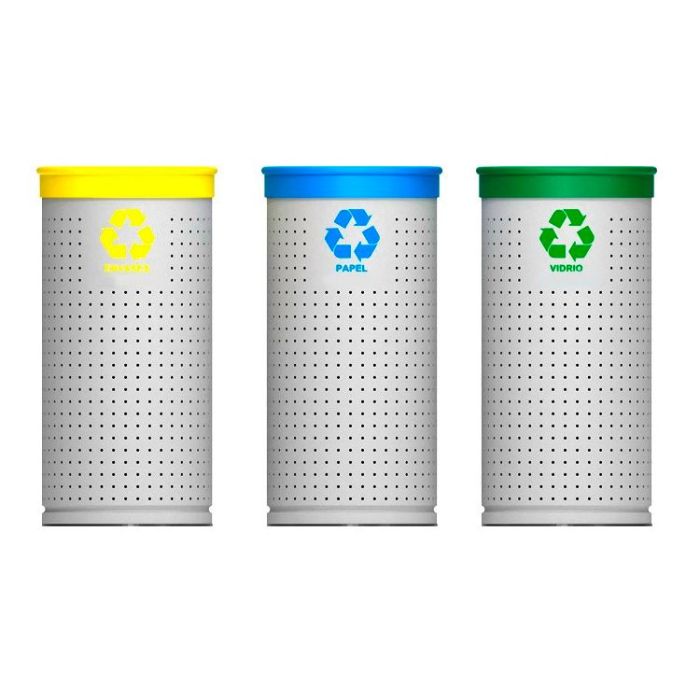 Papelera circular de chapa galvanizada con aro superior para sujetar y ocultar la bolsa y base protegida con burlete de PVC ideal para Centros comerciales, aeropuertos, entradas a empresas o colegios. Este recolector cilíndrico está fabricado en acero de 1,5 mm galvanizado y pintado con pintura epoxi de color gris plata con aros pintados para identificar los residuos a reciclar.