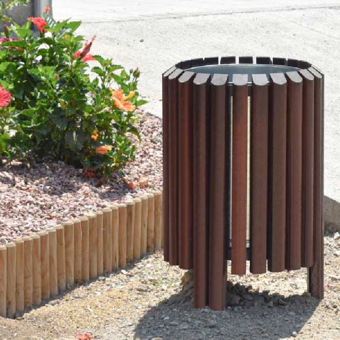 Elegante papelera urbana, con estructura interior metálica y exterior con veinticuatro listones de madera tropical de sección 40 x 35 mm, tratada con el recubrimiento de triple capa con Lignus, protector fungicida, insecticida e hidrófugo, ideal para todo tipo de entornos exteriores como parques, jardines, etc.