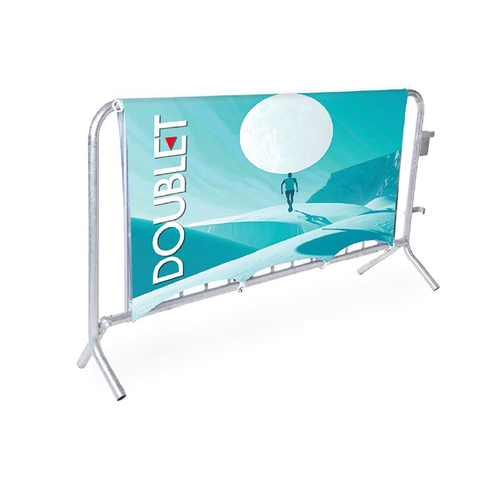 Funda personalizada a doble cara. Extensible y compatible con todas las vallas. Lona en Lycra® doble cara extensible que se acopla a la barrera con anillas de plástico y bridas de sujeción.