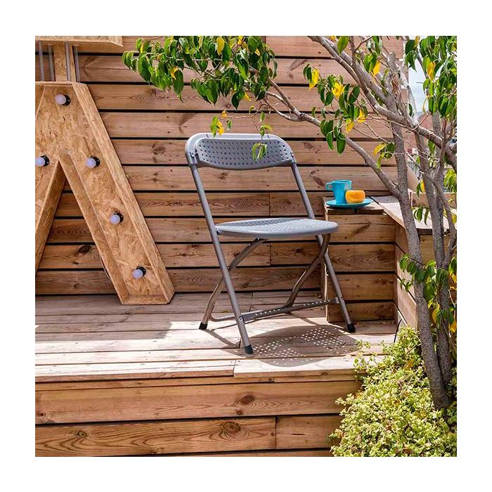 Silla plegable ligera, con gran capacidad de carga, con un diseño moderno, amplia y confortable y con la superficie perforada, que le confiere transpirabilidad al asiento y respaldo y facilita el drenaje en caso de lluvia.