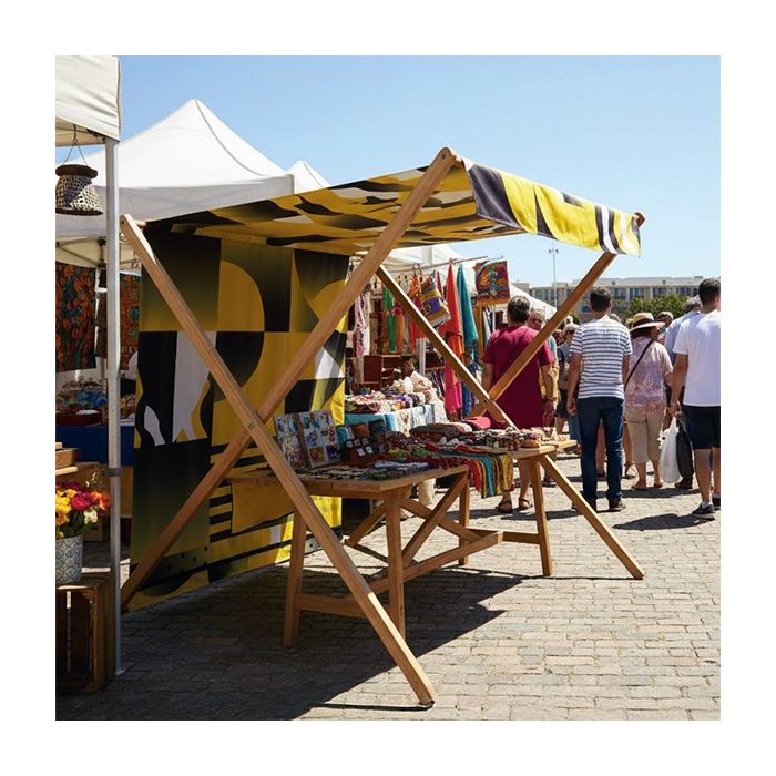Stand plegable Woody personalizado, diseñado para crear zonas de sombra y acogida en eventos al aire libre. Estructura de madera, robusta y fácil de montar, con lona de poliéster intercambiable impresa a doble cara para una comunicación 360° y mayor protección frente a los rayos UV.