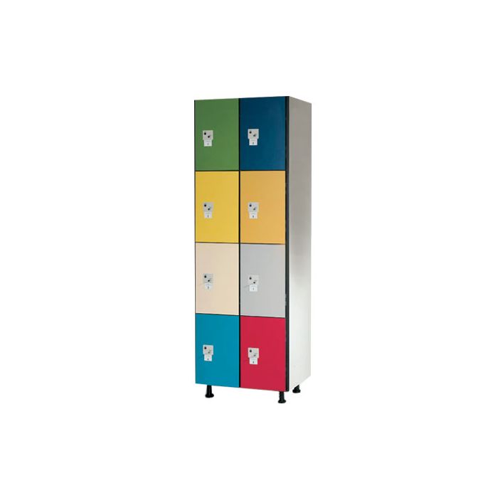 La taquilla fenólica de 8 puertas es la solución ideal para espacios colectivos que requieren un gran número de compartimentos en un solo módulo, manteniendo siempre la resistencia, higiene y durabilidad que ofrece el compacto fenólico HPL.