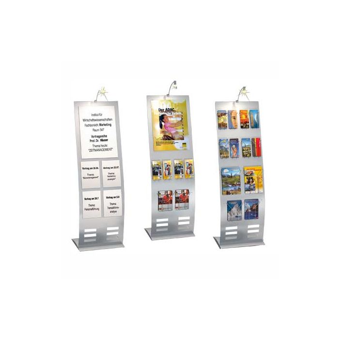 En el expositor portafolletos de pie tipo columna, hay tres compartimentos diferentes disponibles para guardar catálogos para formatos DIN A2, DIN A3, DIN A4, DIN A5 y 1/3 DIN A4 (folletos plegados). Los compartimentos se insertan en la superficie metálica, en la que se perforan pequeños orificios casi invisibles.
