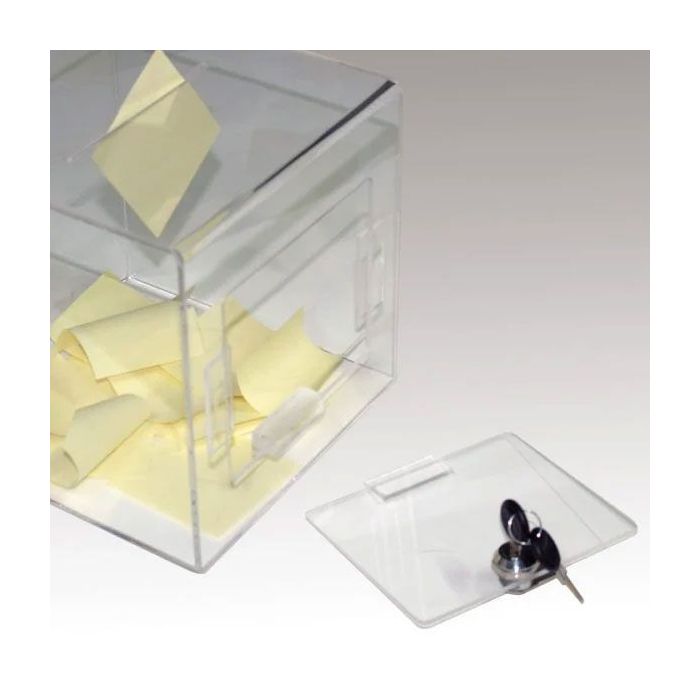 - Caja con cerradura de acrílico transparente.
